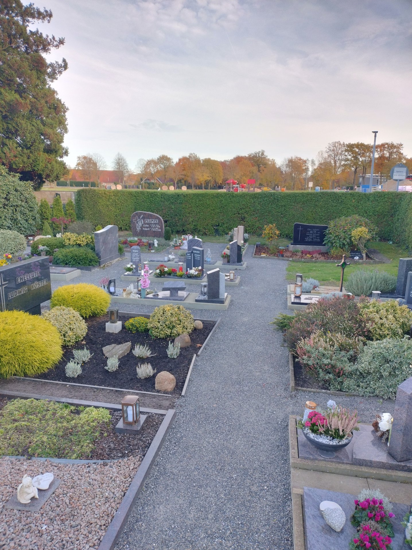 Die Friedhofsgärtnerei der Firma Seveneick hat im September in der südöstlichen Ecke vom Friedhof in Hörstel mit Koers DurEko-mix die Flächen zwischen den Gräber gepflastert. Das Ergebniss sieht sehr charmant aus. Das graue der Deckschicht ist ein Match zu den Randeinfassungen der Wege und der Gräber. Die Farben der Blumenarrangements, Kerzen und anderer Dekorationen, die Besucher aus Liebe zu ihren verstorbenen Angehörigen mitgebracht haben, sind ein Blickfang und verleihen dem Ganzen eine warme, emotionale Atmosphäre.
