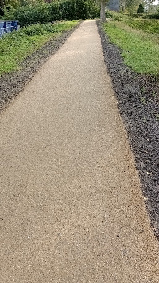Als vervanging is gekozen voor KoMex Geel, een waterdoorlatende halfverharding met een warme, natuurlijke gele kleur. Deze kleur sluit uitstekend aan bij het omliggende landschap en de historische dijkstructuur, waardoor het pad visueel minder dominant aanwezig is dan asfalt. Tegelijkertijd ontstaat een rustig en natuurlijk beeld dat past bij het karakter van de Oude Koedijk.